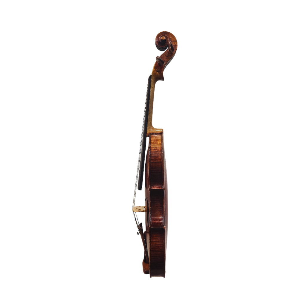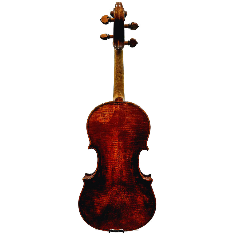 The medium grained two piece quarter cut maple back of medium curl, the maple ribs of deep irregular curl, the maple head of wide medium curl, the table of medium grain spruce, the red – brown oil varnish over a golden ground. The instrument has been antiqued.